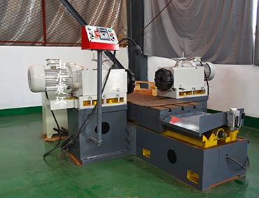半自动双面铣采用铸铁250,导轨采用1V1平结构,直线度更好,通过高频淬火,导轨硬度到达48-52度经久耐磨,工作台宽500,长1.2米,工作台行程1.2米,左右滑台行程各300毫米,加接杆两机头最小可以铣到0 ,最大可以铣到600,左右动力头,采用手动进刀,(产品固定在工作台上,手动调节吃刀量大小,锁住滑板,防止切削中震动走位,导致尺寸不准)中间工作台是无极调速行走,可调节走速的快慢,吃刀量大,走慢一点吃,吃刀量小,走快一点,完成铣削工作。